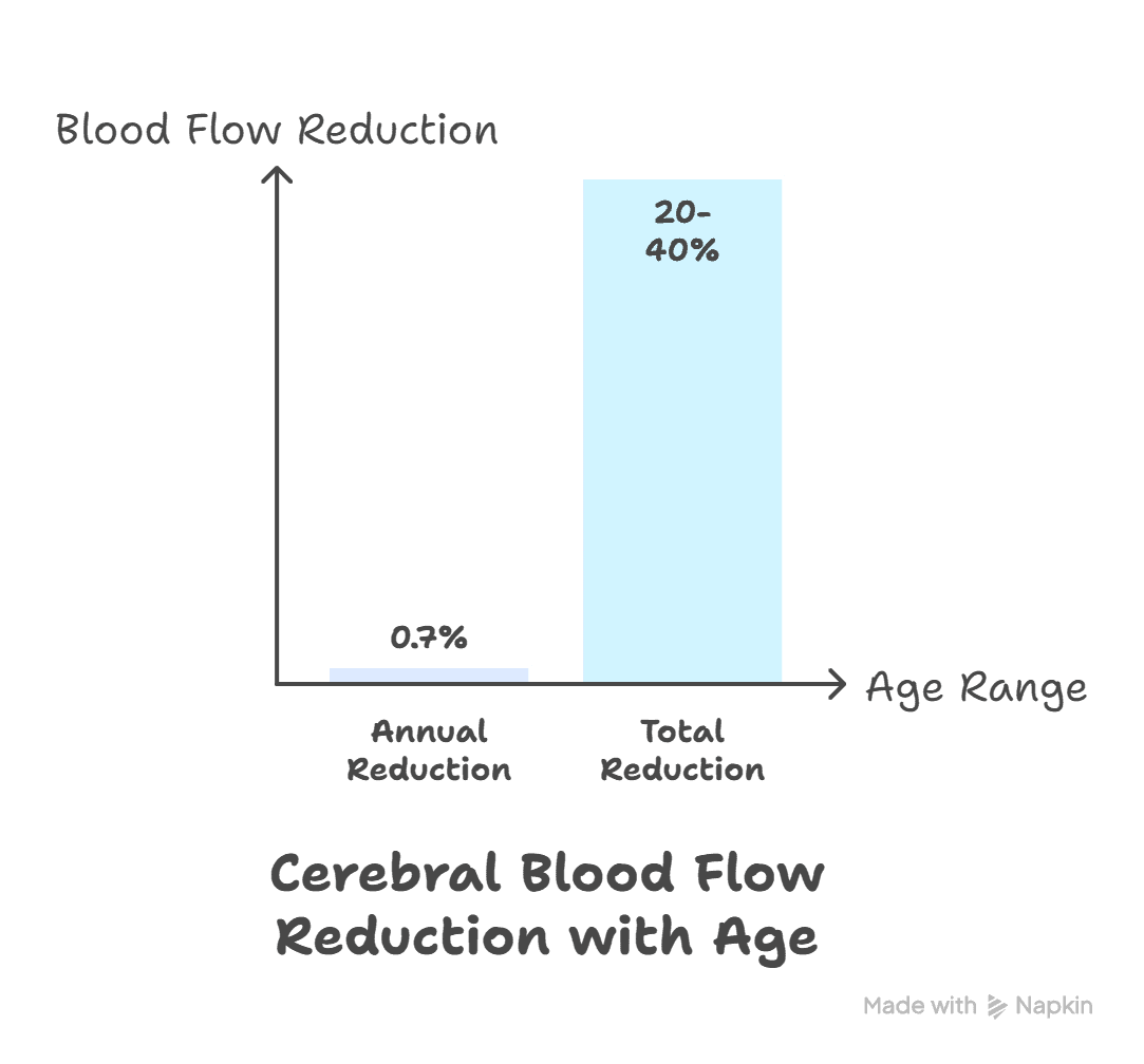 The Fact: Research confirms that cerebral blood flow naturally decreases with age, dropping by approximately 0.7% per year. This results in a 20 to 40% reduction between the ages of 20 and 80.